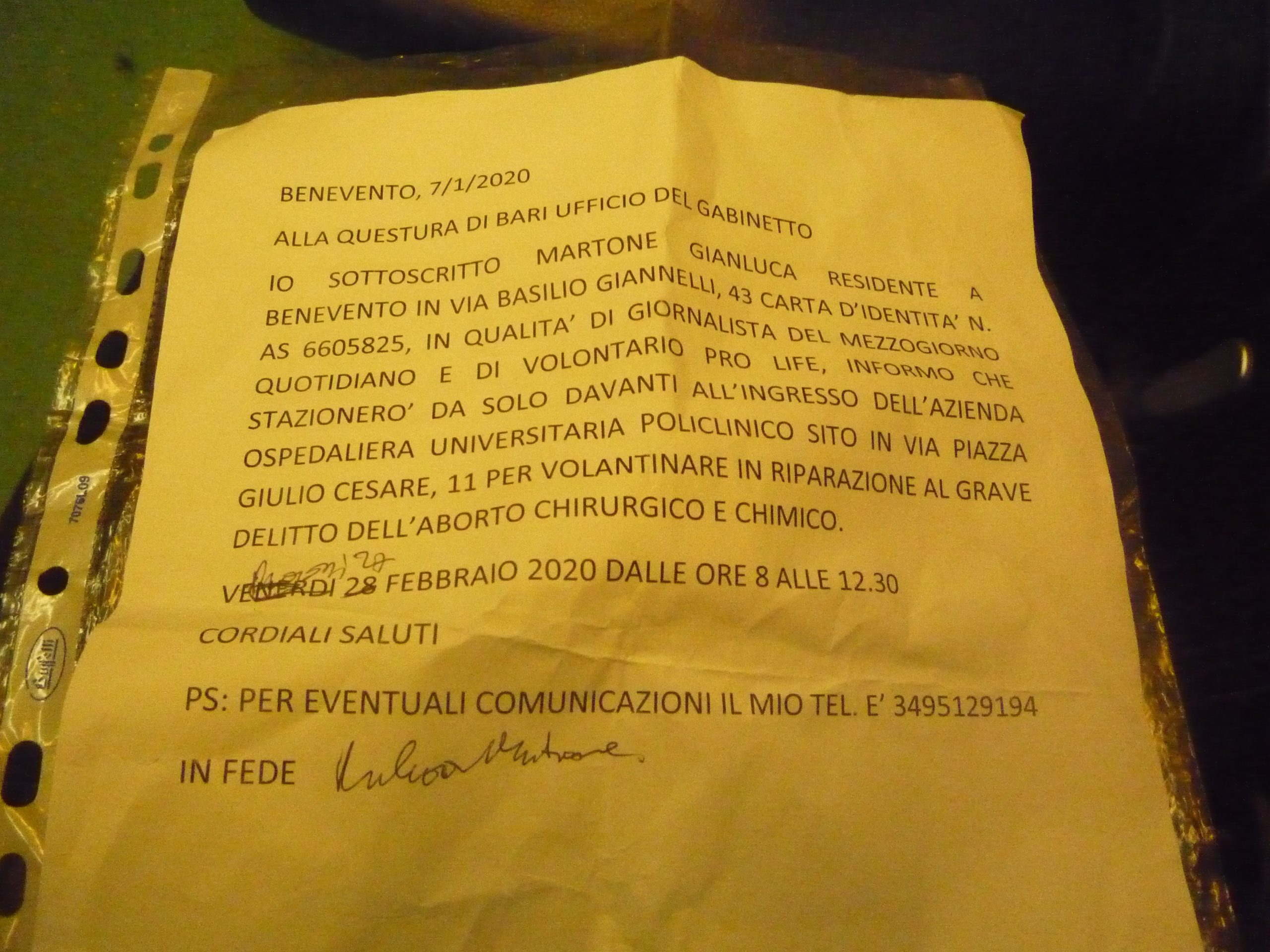 Un episodio gravissimo è accaduto questa mattina al Policlinico di Bari, durante il mio solito sit in contro l’aborto che tengo ormai mensilmente da due anni, con regolare avviso di comunicazione inviato tramite Pec all’Ufficio del Gabinetto della questura di bari, come si vede da allegato. Ecco la cronaca di questo increscioso avvenimento. Giunto intorno alle 9 al Policlinico, come di consueto ho iniziato a volantinare in modo pacifico alle persone. Mentre volantinavo, è giunto il direttore dell’ospedale, intimandomi piu’ volte di togliere il manifesto contro l’aborto, che ci tengo a sottolineare espongo da due anni, senza che nessuno mi abbia mai detto nulla. Io ho sempre risposto negativamente a questa assurda pretesa. Il direttore non soddisfatto di questa mia risposta negativa ha subito fatto intervenire un addetto della security, che mi conosce da anni, il quale mi ha nuovamente intimato di spostare il manifesto. A questo punto, per evitare uno scontro verbale, l’ho spostato di qualche metro. Nonostante questo gesto, la pressione dei due soggetti non si è fermata. Infatti, mentre pregavo il Rosario, senza mai dire NULLA, per non esacerbare gli animi, il direttore diceva all’addetto della security: Dobbiamo liberarci di questo soggetto ad ogni costo, è una questione personale. Pochi minuti dopo, giunge un poliziotto che, con toni minacciosi, mi invita a seguirlo nel gabbiotto della Polizia di Stato posto all’interno dell’ospedale. Il sottoscritto letteralmente tolto di peso dall’ingresso dell’ospedale ha avuto appena il tempo di prendere il borsello con i soldi, lasciando tutte le mie cose accanto all’ingresso. Una scena orribile. Io sono una persona PERBENE, INCENSURATA, ho sempre rispettato la legge e sono trattato da questo esponente delle Forze dell’Ordine come un CRIMINALE, un MAFIOSO, un CAMORRISTA. Dopo circa 45 minuti di controllo, questo poliziotto mi ha detto: LEI E’ AUTORIZZATO A VOLANTINARE DOMANI, NON OGGI ( Ci tengo a precisare che non ho bisogno di alcuna autorizzazione per volantinare, in base all’18 TULPS, che mi impone solo di dare AVVISO DI COMUNICAZIONE). La sua email per oggi non è giunta ( menzogna colossale perché io ho la copia dell’email, come volevasi dimostrare: [Nessun oggetto] Messaggio di posta da gianluca.martone@libero.it: [Nessun oggetto] gianluca.martone@libero.it 24/2/2020 11:58 A urp.quest.ba@pecps.poliziadistato.it