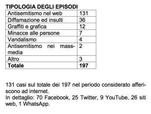 Dunque facciamo chiarezza: i 197 episodi di antisemitismo resi pubblici non hanno nulla a che vedere con quanto accade sul web, e dipendono da segnalazioni varie di singoli fatti, che vanno dallo sputo alla scritta sul muro. I nostri dati si riferiscono appunto ai messaggi d’odio sui social network: 200 al giorno sono quelli verificati, e anzi potrebbero essere molti di più.