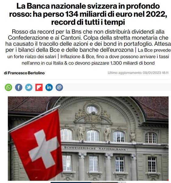 Sempre leggendo Fitch Ratings sia apprende che: “gli approcci contabili mark-to-market hanno provocato di recente perdite particolarmente ingenti presso la Banca nazionale svizzera (BNS) (che infatti annuncia che non invierà più soldi ai Cantoni nel breve periodo) e la Reserve Bank of Australia (RBA) – queste ultime sufficienti a spingere la RBA in un patrimonio netto negativo”.