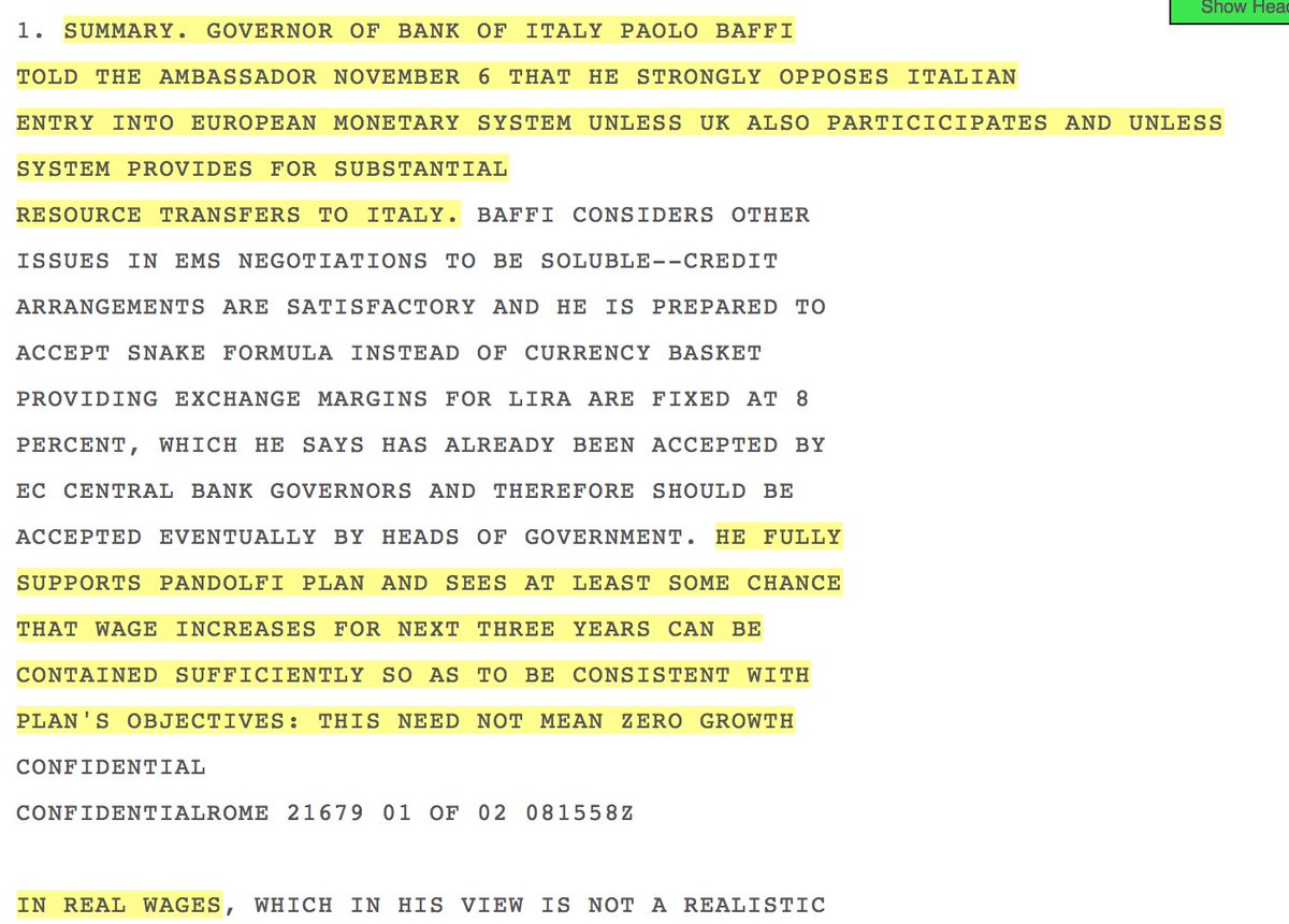 Avvenne nel 1979, i giovani non possono ricordare. Ebbene: ecco qui sotto un rapporto della CIA, recentemente declassificato. Dice che nel novembre ’78 “il governatore Baffi, parlando con l’ambasciatore USA, s’è detto fortemente contrario all’entrata nel Sistema Monetario Europeo (SME), a meno che non vi entri anche il Regno Unito, e non vengano previsti “sostanziosi trasferimenti” all’Italia.
