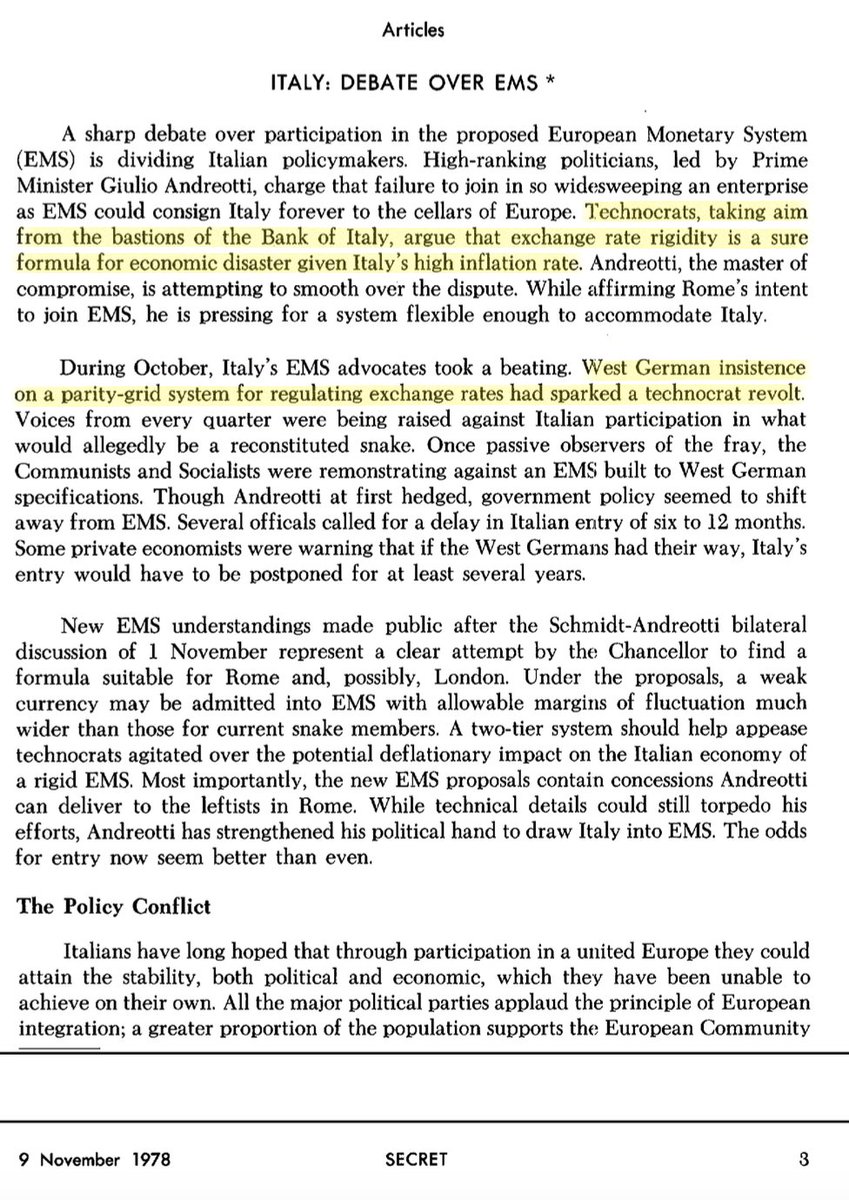 Un altro rapporto CIA poco posteriore (novembre ’79) riferisce addirittura di una “rivolta dei tecnocrati” di fronte alla pretesa tedesca di entrare nel sistema monetario con cambi rigidissimi. “i tecnocrati, forti del bastione di Bankitalia, ribattono che la rigidità del tasso di cambio è la formula sicura per il disastro economico”…E infatti Baffi e Sarcinelli, in dure trattative con i banchieri centrali tedesco e francese, erano riusciti almeno a strappare una oscillazione “larga” del 6% invece di una stretta.