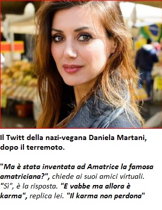 No, non crediate che sia una pazza isolata. Non solo ne conosco decine di animaliste che la pensano così. E che Daniela Martani, esercita la propria libertà di pensiero, il suo “diritto all’opinione”, la maggior conquista della demokrazia. Il diritto ad avere una opinione del tutto svincolata da qualunque obbligo – anche l’obbligo di adesione alla razionalità. Infatti aderire alla ragione “limiterebbe” la libertà dell’individuo; e l’individuo oggi è stato liberato da tutto, anche dal dovere di non sragionare.