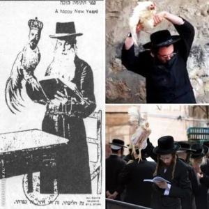 Del resto, prima della Grande Guerra (1914-18) a Varsavia, nei negozi ebraici, si vendeva una cartolina di auguri per lo Yom Kippur in cui si vedeva un rabbino che con la Torah in una mano e un uccello sull’altro braccio: l’uccello portava la testa coronata dello Zar Nicola. E’ l’allusione ad un sacrificio di una gallina bianca praticato dagli ebrei più religiosi nello Yom Kippur: il fedele si fa passare la gallina sopra la testa poi la sgozza e la dissangua, pronunciando la formula: “Questa è una bestia sacrificale, così sia la mia purificazione”. Un tipico sacrificio rituale di sangue,non privo di contatti psichici col voodoo.