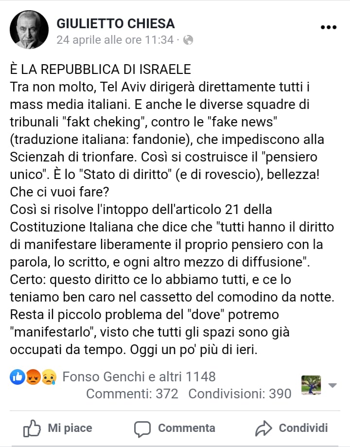 “La Repubblica di Israele”, appunto. E Chiesa registra il chiUdersi della censura coi ai tribunali di fact cheking allestiti dal governo illegittimo e doppiati, anche con gli stessi “smascheratori” in condominio, dal controllore Enrico Mentana e il suo David Puente e il team di Online: dove si attaccano i siti alternativi non per le bufale, ma per le opinioni difformi,non ammessse dalle Nuove Disposizioni: operazione di censura organizzata dai padroni del discorso verso i pochi angoli che si sottraggono al totalitarismo mediatico così completamente instaurato.