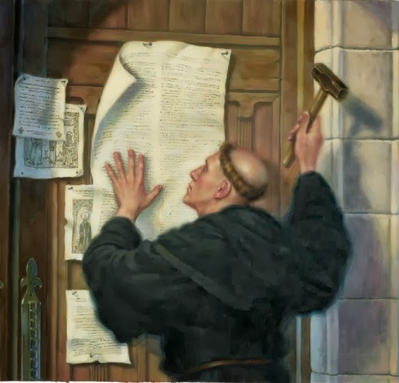 Si rivoltò, o meglio volle rivoltarsi cogliendo questa occasione contro la Chiesa come già si era rivoltato contro Dio e il 31 ottobre del 1517 affisse sulla porta della chiesa del castello di Wittenberg le 95 Tesi della sua nuova dottrina. In esse (specialmente nella 84, 85 e 86) si trova una forte tendenza all’avarizia e all’attaccamento al denaro, che lo porterà al sequestro dei beni della Chiesa e alla loro incamerazione. “I soldi hanno un ruolo di primo piano nello scoppio e nella diffusione della riforma” (A. Pellicciari, cit., p. 30). Tuttavia l’essenziale della dottrina luterana riguarda la giustificazione dell’uomo, che secondo Lutero è stato totalmente distrutto dal peccato originale e quindi non può fare che il male, senza sua colpa, la quale finalmente ricade su Dio. L’odio contro Dio è connaturale al Protestantesimo e porta con sé la rivolta contro la Chiesa romana fondata da Gesù su Pietro. Non si può capire lo scisma luterano da Roma se non si ha presente la rivolta di Lutero contro la giustizia divina a causa dell’eresia sulla corruzione sostanziale della libera volontà umana. Per esempio nella terza Tesi di Wittenberg si legge: “l’uomo diventa simile ad un albero marcio e può volere e fare solo il male” e nella quinta Tesi: “la volontà umana non è libera di scegliere il bene o il male, ma è schiava [del male]”.