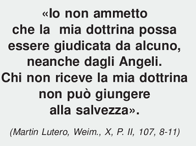 Anche qui si nota come Lutero ha cancellato con un colpo di spugna 1. 500 anni di storia del Cristianesimo. Egli ha mantenuto la “Sola Scrittura”, ha elimina la Tradizione, i Commenti dei Padri ecclesiastici, l’interpretazione del Magistero, l’Autorità del Papa come Vicario di Cristo e successore di San Pietro. Ha ricominciato tutto da zero, come se nulla fosse esistito, tranne la Scrittura che ognuno interpreta a modo suo e le fa dire ciò che più gli aggrada. Giustamente Angela Pellicciari nota che “un solo frate che va contro tutta la Cristianità di un migliaio di anni deve essere nell’errore” (cit., p. 77).