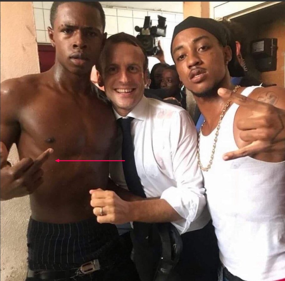 La foto di Macron ridente come un ebete infoiato a fianco di un negro a torso nudo che gli faceva “le doigt d’honneur” ha suscitato polemiche. L’aprile scorso, un pensionato di 62 anni per aver fatto “le doigt d’honneur” al presidente è stato arrestato, trascinato in tribunale e condannato a pagare una multa di 7500 euro. Non era negro, a torso nudo né omosessualmente eccitante.