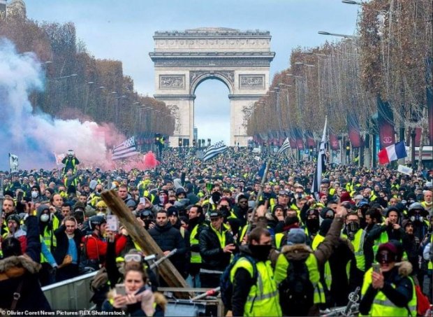“E’ la peste bruna quella che ha manifestato” sugli Champs Elysées, ha dichiarato  un ministro di Macron, Gérald Darmanin.  “Due-trecento militanti ultradestra”  hanno istigato i danneggiamenti,  ha rincarato Laurent Nunez, sottosegretario degli Interni. Detto fatto, i media si sono lanciati: sono neri, sono fascisti.  Anzi, nazi. La BFMTV ha mostrato un maturo giubbetto giallo che alza il braccio: “Saluti nazisti!”. “Parigi 1940? No, Parigi 2018”,  ha twittato la deputata macronista Naima Moutchou,  che fra l’altro è relatrice del  progetto di legge contro  la manipolazione dell’informazione. E’ stata subito sbugiarda da FranceInfo:   il manifestante alza il braccio sì, ma sta dicendo “Ave Macron!”-