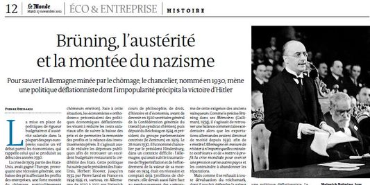 Anche allora, la dirigenza tedesca adottò, come terapia, la deflazione. Lo ha descritto Bruno Heilig, un giornalista ebreo che nel ’38 scampò ai nazisti con la fuga. “Ogni segno di crisi fu scongiurato comprimendo i salari e licenziando lavoratori”; sostituiti da macchinari, che aumentavano la “produttività”. Ma “per ogni lavoratore licenziato, era anche un consumatore che spariva”. Nel 1931, invece di aumentare i salari, si prese la misura disperata di ridurre la produzione di merci. Ma per gli industriali, “tasse, ammortamenti, affitti, gli interessi sul debito, ossia i costi fissi, divisi su un numero minore di beni, aumentarono in proporzione inversa sui profitti calanti, fino a divorarli”. Industrie fallirono a catena.