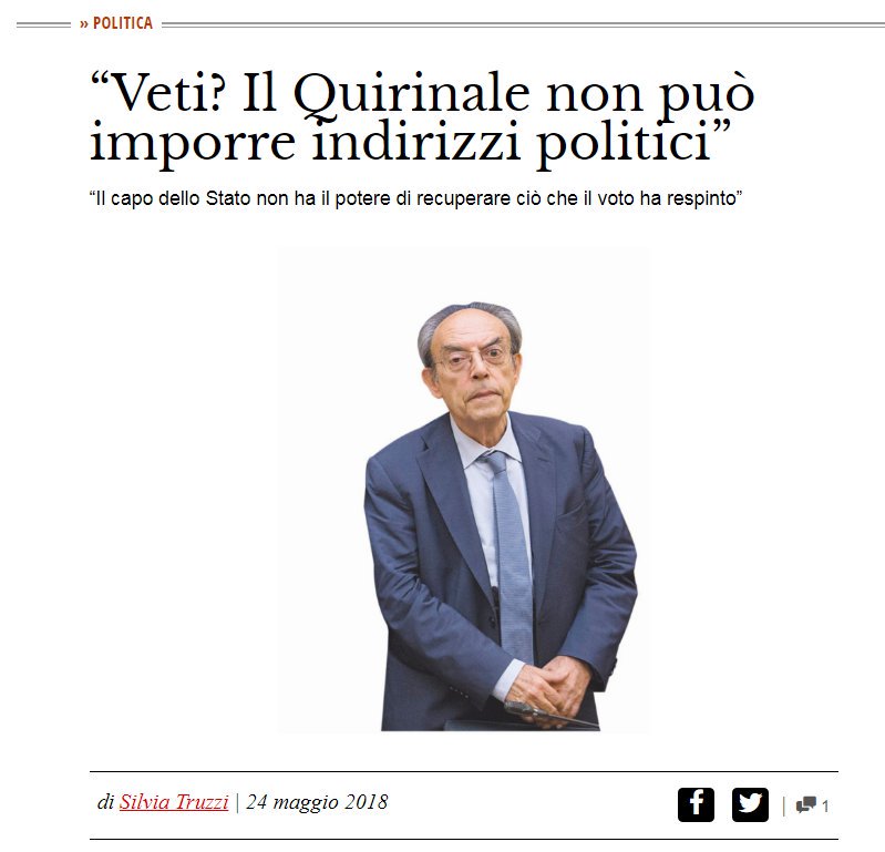 Con un comunicato ufficioso il Quirinale ha fatto sapere di non accettare diktat sul ministero dell’Economia da parte di Matteo Salvini e Luigi Maio, di fatto sbarrando la porta al professore Paolo Savona. Verto che la Costituzione prevede un confronto fra il premier incaricato (il professore Giuseppe Conte) e il capo dello Stato (Sergio Mattarella) sulla squadra ministeriale. E per i compiti del presidente della Repubblica è naturale che lui consigli su ministerto degli Esteri e ministero della Difesa, temi che gli competono. Ma il ministero dell’Economia è il più politico che c’è. Più decisivo del premier. E tocca giustamente ai partiti di maggioranza scegliere la persona che applica il cuore del programma. Se quella casella fosse scelta da Mattarella, il voto degli italiani sarebbe inutile, e il programma di governo carta straccia. Meglio per loro allora non fare partire questo esecutivo…
