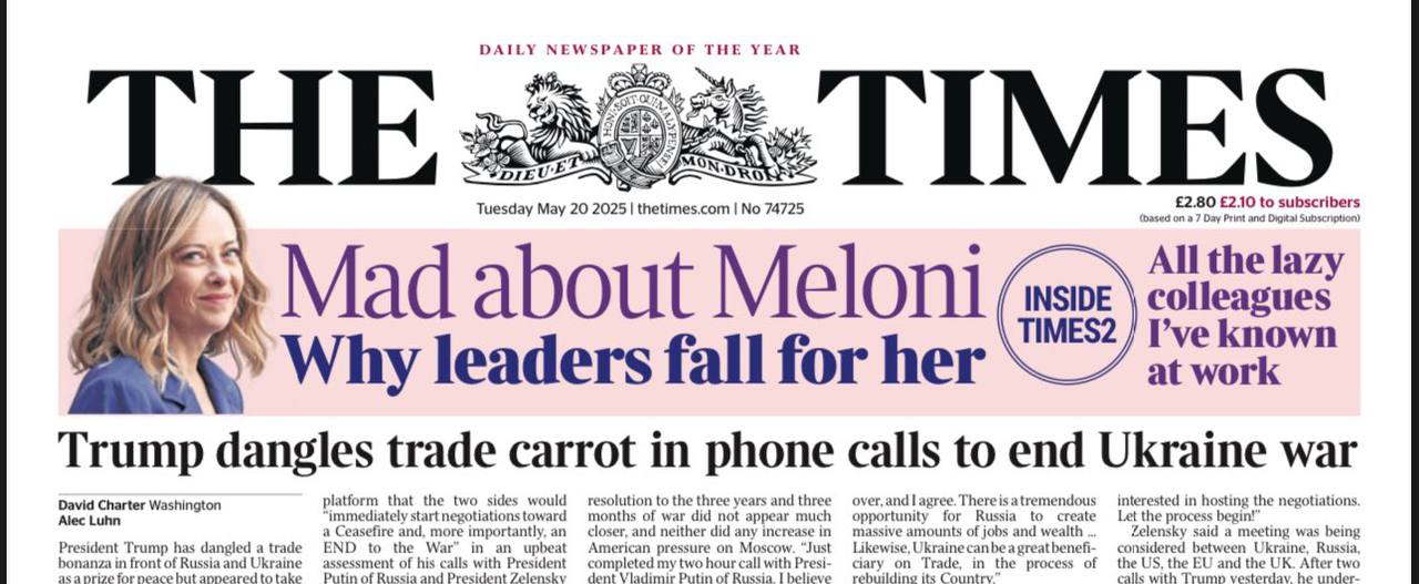 “Tutti pazzi perMeloni”https://www.secoloditalia.it/2025/05/il-times-certifica-tutti-pazzi-per-giorgia-meloni-i-leader-fanno-a-gara-per-avvicinarla-un-coccolone-per-la-sinistra/