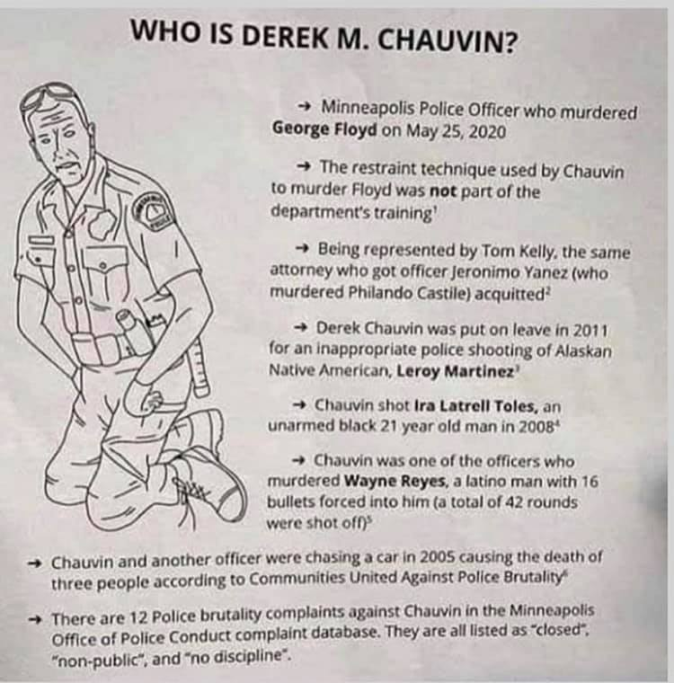 (Rettifica: ho detto che Chauvin era in congedo dal 2011. Mio errore: è stato riassunto dalla polizia, nonostante sei omicidi in servizio e 17 lagnanze per brutalità.