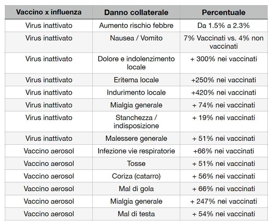 E ora, per aiutarvi a decidere se vale la pena vaccinarsi per avere una riduzione del rischio influenzale dell’1%, riporto due numeri particolarmente rilevanti, e poi una tabella riassuntiva degli effetti collaterali causati dai vaccini influenzali secondo la Cochrane Review.