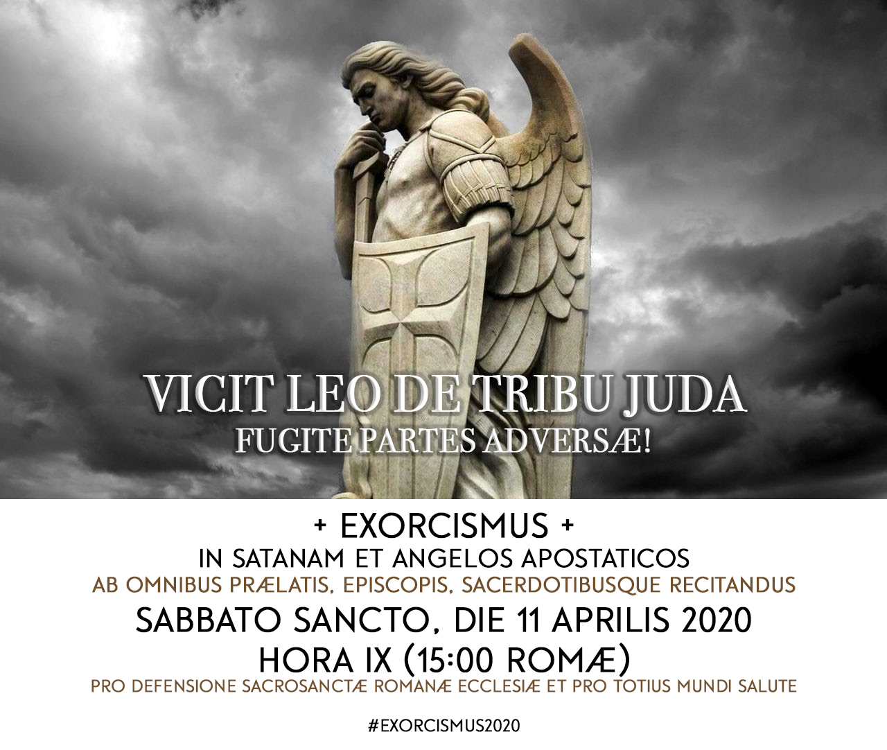 Chiedo di pregare, nella forma che Leone XIII stabilì per tutta la Chiesa, recitando tutti insieme l’Esorcismo contro Satana e gli angeli ribelli (Exorcismus in Satanam et angelos apostaticos, Rituale Romanum, Tit. XII, Caput III), alle 3 pomeridiane (15:00 ora di Roma – CEST) di Sabato 11 Aprile 2020, unendoci in una spirituale battaglia contro il comune Nemico del genere umano.