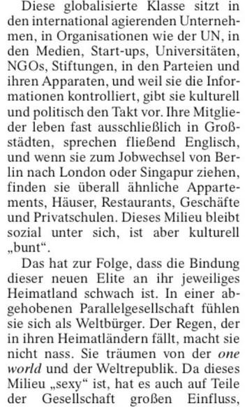 Gauland ha detto: “Questa classe mondializzata siede nelle grandi imprese persenti sulla scena internazionale, nei media, nelle università, nelle ONG, nelle fondazioni, nei partiti e loro apparati, e poiché controlla l’informazione, dà il “La” sul piano politico e culturale. I suoi membri vivono quasi senza eccezione nelle grandi città, parlano inglese, e passando da un job all’alto a Berlino, Londra, Singapore, frequentano tutti gli stessi appartamenti, le stesse case, gli stessti ristoranti, gli stati negozi e le stesse scuole private. […] La conseguenza è che il legame fra questa nuova elite e la sua terra d’origine è debole. Questa gente si sente come cittadina del mondo in una società parallela. La pioggia che cade nelle loro terre d’origine non li bagna”.