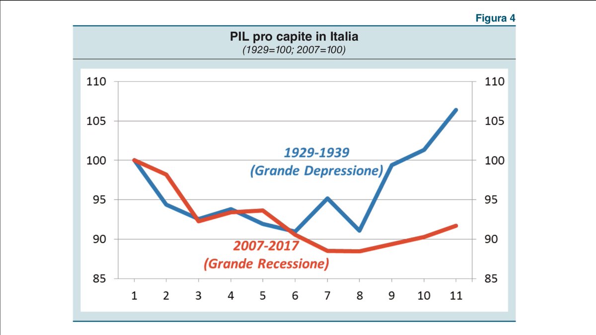 “Perché 11 anni dopo la crisi del 1929 noi italiani avevamo un reddito superiore del 6% rispetto al momento dello scoppio della crisi. Mentre nel 2017 eravamo a -8% circa rispetto al 2008 (dati #bankitalia – ricavati da Fabio Dragoni).
