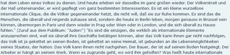 “Una piccola cricca internazionale sradicata che attizza l’odio tra i popoli e non vuole che vivano tranquillamente. E’ la gente che è a casa dovunque e in nessun luogo,m che vivono oggi a Berlino e potrebbero vivere domani a Bruxelles, dopodomani a Parigi, poi a Praga, Vienna, Londra …A differenza del popolo che non può seguirla, perché il popolo è incatenato alla sua terra d’origine, è dipendente da quallo che può offrirgli il suo Stato la sua nazione. Il contadino è legato alla terra. L’operaio, alla sua fabbrica. Quando va male, dove può trovare meglio?”