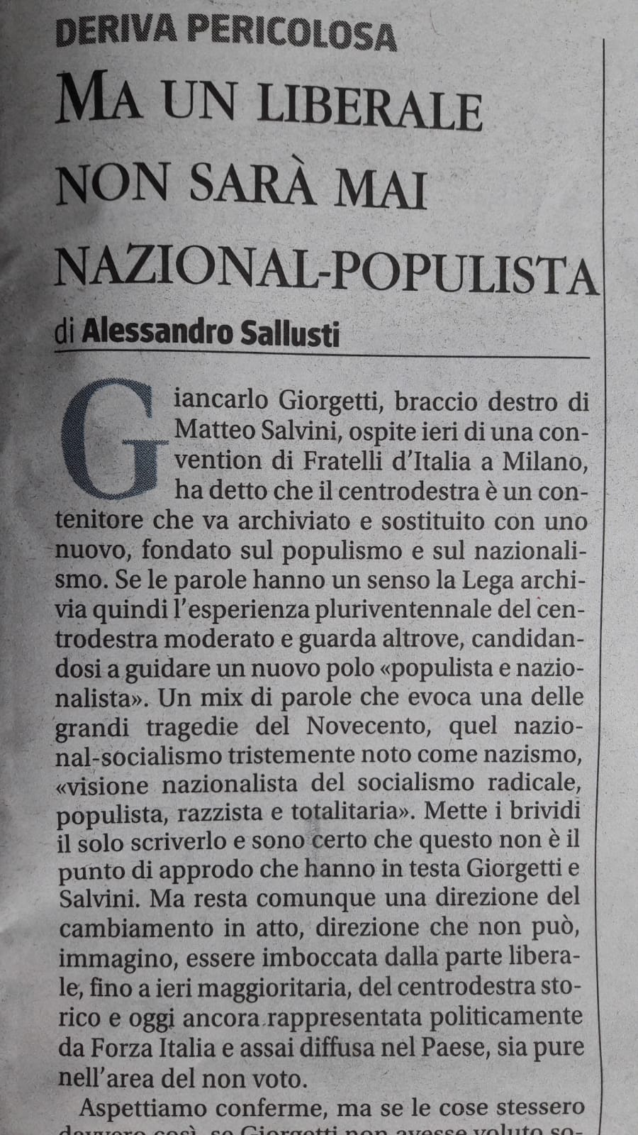 Ora i berlusconiani si allineano a questa resistenza pseudo-antinazista come ala “liberale”. E’ appena il caso di ricordare che il primo a stilare l’equazione è stato l’oggi giudice costituzionale (dopo essere stato lo spoliatore dell’economia nazionale) Giuliano Amato: “OGNI sovranismo ha SEMPRE una matrice razzista”, sancì già da luglio.