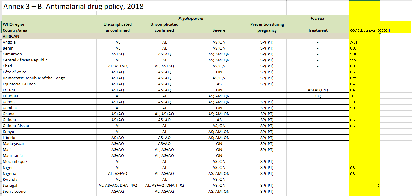Nessun paese della fascia malarica in Africa ha più di 5 o 6 morti di covid ogni 100.000 abitanti . In Sud America la malaria praticamente non esiste o non esiste più che in pochi paesi, e non ci sono dottori che sfidino il divieto dell’idrossiclorochina sancito dall’OMS … Risultato: il record appartiene al Messico con lo stesso tasso di mortalità della Francia, 89 ogni 100.000 abitanti. La Colombia sfugge per lo più alla malaria ma non al covid (77 morti ogni 100.000, lo stesso per il Perù (114) Non c’è malaria in Cile, ma per covid 84 morti ogni 100.000.