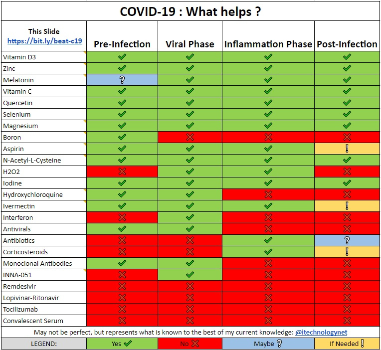 Qui una tabella “selvaggia” di ciò che è risultato utile nella pratica. Interessante l’elenco delle sostanze che aiutano nella profilassi (per-infection): dall’aspirina alla viatmina D, dall’acetilcisteina (Fluimucil…) allo zinco. Da nessuna parte appare la “terapia Speranza”: solo tachipirina e aspetta di soffocare…