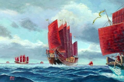 Nel 1430 una flotta composta da centinaia di enormi navi e migliaia di marinai, capeggiati dall’eunuco ammiraglio Zheng He, toccò la Persia e l’Arabia, l’India e l’Africa; fu la maggiore e qasi leggendaria prova d di marineri dell’Impero del Mezzo. Ma il nuovo imperatore ordinò che le grandi navi fossero distrutte e non si facessero più spedizioni per mare, perché contrarie al “divieto marittimo” (Haijjin) e alle ingiunzioni ancestrali di Hongwu (1328-1398) il fondatore della dinastia Ming, grande nemico dei “pirati”, categoria in cui comprendeva tutto il commercio internazionale su navi. Dell’imperatore Hongwu si ricorda questo decreto: