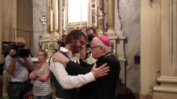L’abbraccio tra Giuliano Costalunga e il vescovo Zenti (Foto Zambaldo)