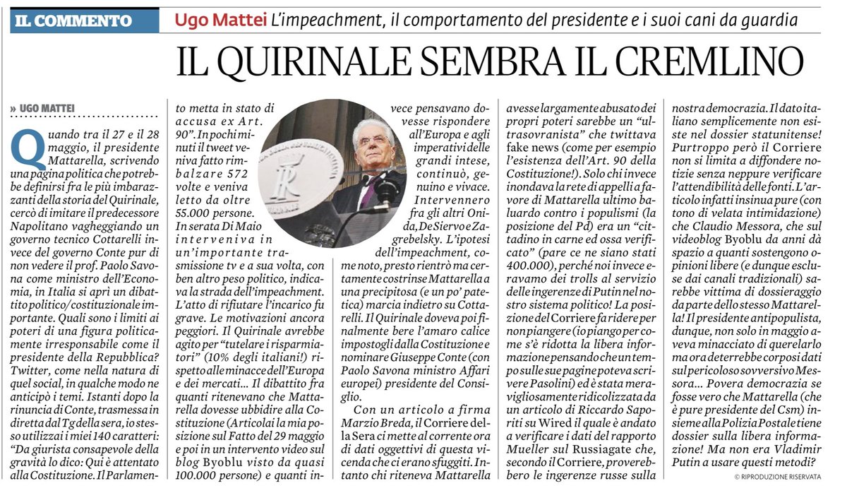 Ugo Mattei è un giurista. E’ professore di diritto internazionale e comparato all’Hastings College of the Law dell’Università della California a San Francisco, ed è professore di diritto civile all’Università di Torino. Si situa ideologicamente molto a sinistra, collaborando come editorialista de il manifesto e collabora regolarmente con il Fatto Quotidiano, ed essendo stato vicepresidente della Commissione Rodotà presso il Ministero della Giustizia (2007). Orbene, Ugo Mattei ritiene, da giurista, che Mattarella, rifiutando Paolo Savona come ministro, abbia commesso un attentato alla Costituzione.