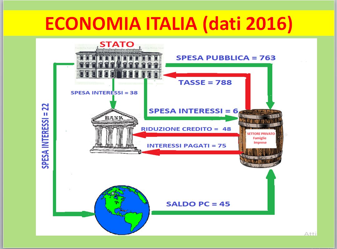 Perché nessuno spiega che “il PIL dell’italia è cresciuto in media del 2% di meno l’anno di quello che poteva, perchè il 4 o 5% del PIL veniva pagato in interessi e di questo il 2% andava all’estero” (Zibordi), e il deficit di cui tanto ci fanno colpa “è dovuto solo al pagamento d’interessi..che oggi finiscono in larghissima parte a banche e non residenti, per cui a restare in deficit sono solo famiglie e imprese italiane”: