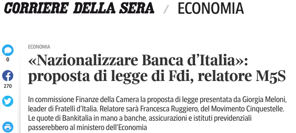 L’enunciato di Conte è anche una bastonata a Claudio Borghi, che da settimane chiedeva un norma che stabilisse che l’oro della banca centrale appartiene ai cittadini, dunque allo Stato. Silenzio dei media, anche del web “filo-governativo”.