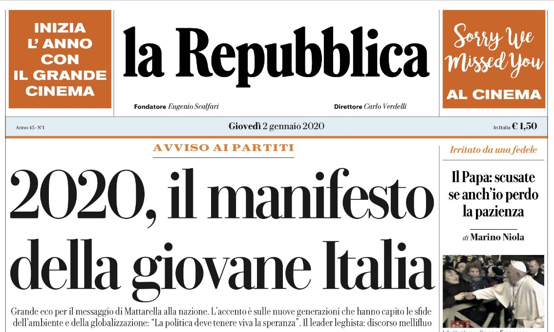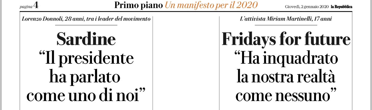 Quando il saluto di capodanno viene trasmesso a reti unificate, e praticamente tutti (anche in parte l’opposizione) lo trovano intelligente, profondissimo e si sforzano di leggervi i sensi più profondi, e le direttive – anche i non detto – anzi Repubblica vi trova la direttiva futura, Il Manifesto della Giovane Italia