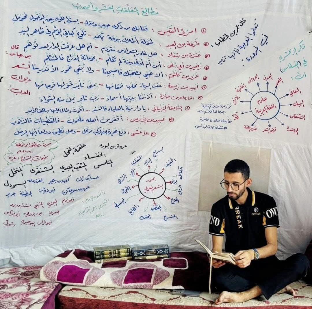 Hamza Abu Touha è un insegnante di Gaza. Tra le macerie, i bombardamenti e i morsi della fame, revisionava gli appunti per una lezione, accuratamente vergati sul tessuto della tenda dove è sfollato. Scrive: “Questa è la mia casa — una tenda che sembra una fornace ardente. Faccio fatica persino a respirare o muovermi normalmente.