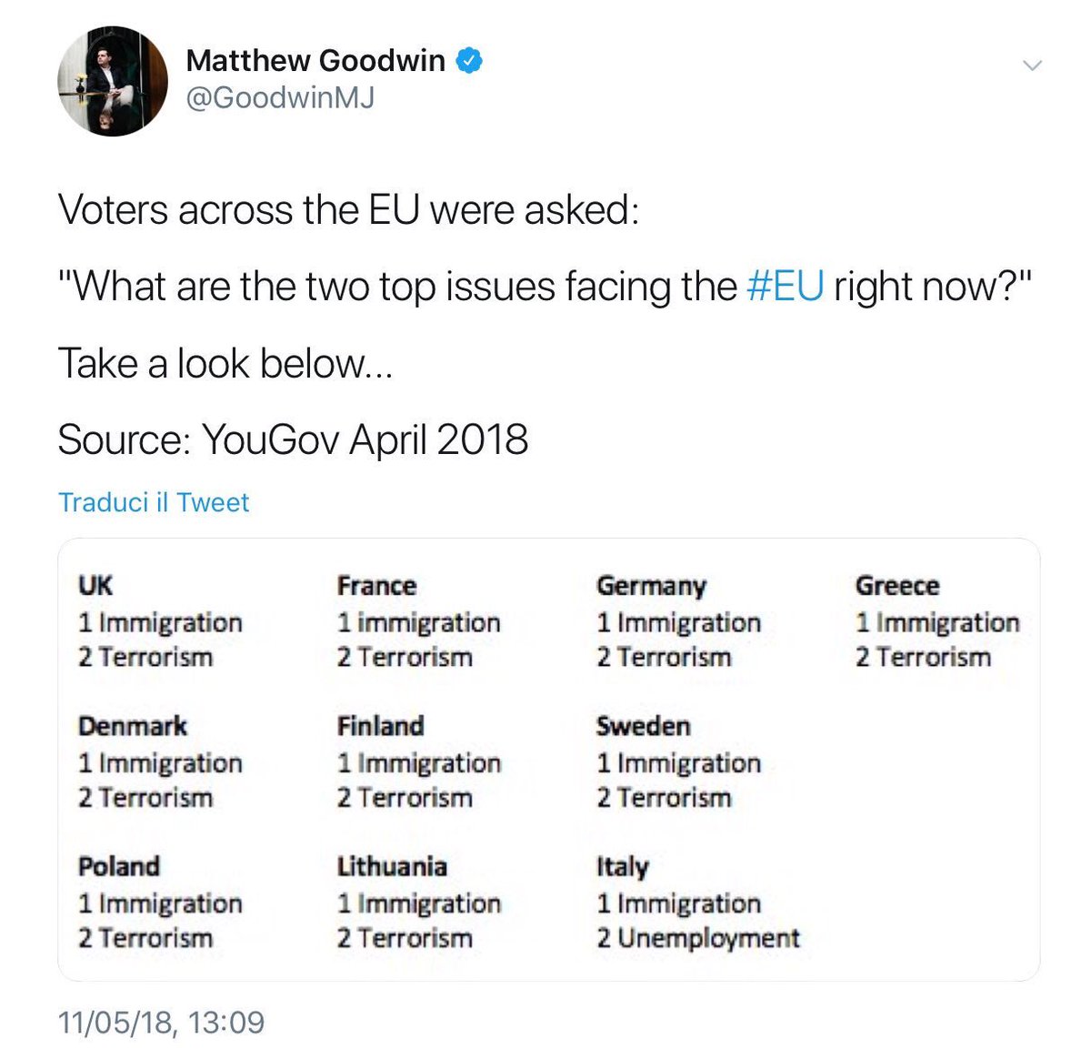 Merkel deve aver visto questo sondaggio: quale è la prima preoccupazione degli elettorati in Eurpèa? “L’immigrazione”. E la seconda? “Il terrorismo”. Solo gli italiani rispondono “La disoccupazione”