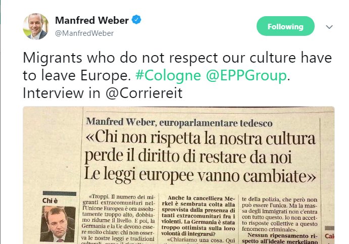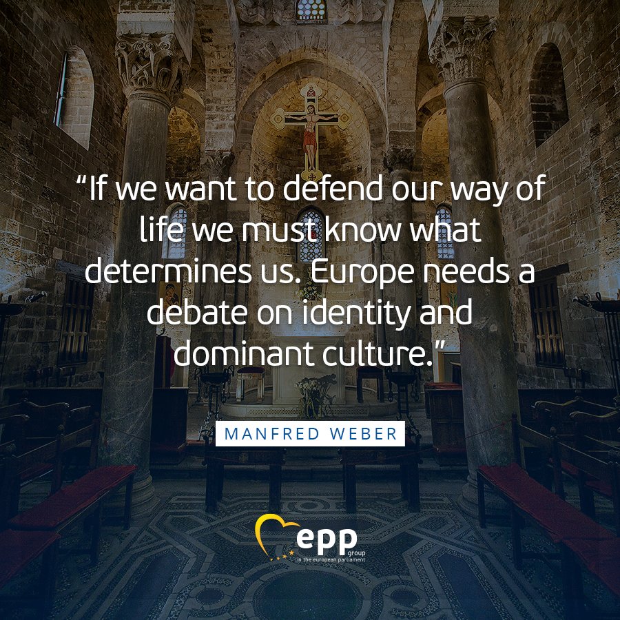 Quindi, ecco l’opportuno riposizionamento del PPE e guida germanica: anche il leader del PP e prossimo presidente , il sullodato Weber, è su posizioni esplicitamente anti-immigrati, anzi identitarie e religiose : ecco una delle sue frasi celebri con cui si fa propaganda , e guardate su che sfondo l’ha fatta stampare – una chiesa, un crocifisso. E la frase suona così:![]()