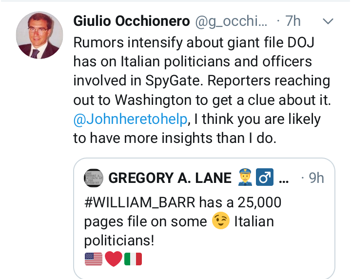 Ormai si moltiplicano segnali di imminente arrivo della tempesta a Roma….questo si comprende bene proprio dal silenzio di tomba dei media mainstream italiani sul FISAgate, anzi questa è la prova regina del fatto che l’Italia è coinvolta appieno nello scandalo.
