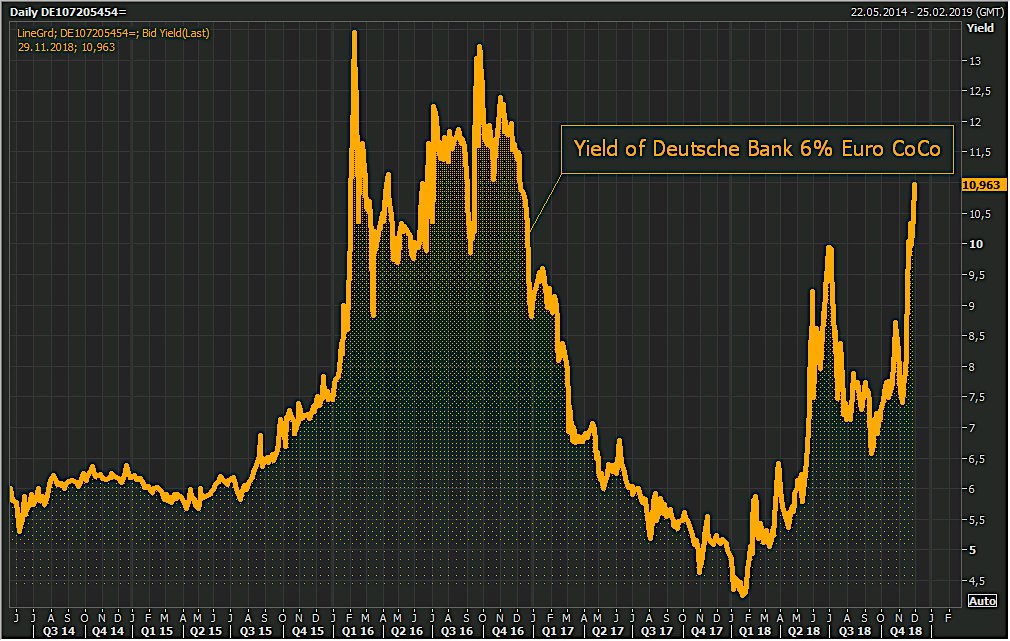 I costi di finanziamento per Deutsche Bank continua a crescere come gli investitori di credito ottenere sempre più nervoso. La resa dei Bond CoCo al 6% balza a quasi l’11% (Holger Zschaepitz , Die Welt)