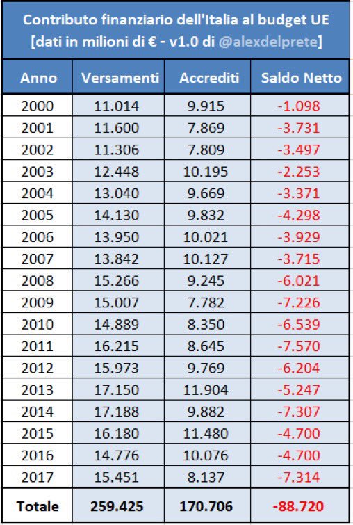 Ecco, questi sono i conti della serva (inoppugnabili): sarebbe bello andare a spiluccare per fare bene i conti… mi pare di poter dire che il debito italiano, al netto delle spese fatte per la UE o autorizzate direttamente dalla UE cresca poco e addirittura diminuisca in rapporto al pil. Cosa pretendono da noi? Che diamo una pasticca di cianuro a chi va all’ospedale per risparmiare sulle spese e ovviamente continuare a spedire miliardi a Bruxelles per pagare lauti stipendi a questi signori?
