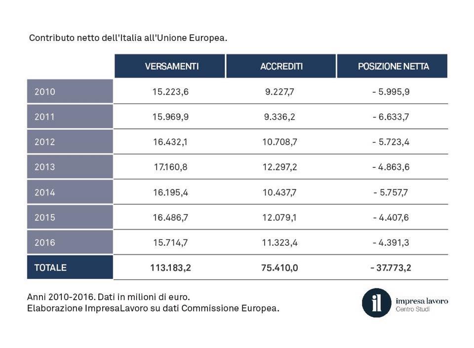 Dall’altro lato ogni anno ci indebitiamo per circa 14 miliardi all’anno per trasferire fondi alla UE. In sei anni fanno 84 miliardi.