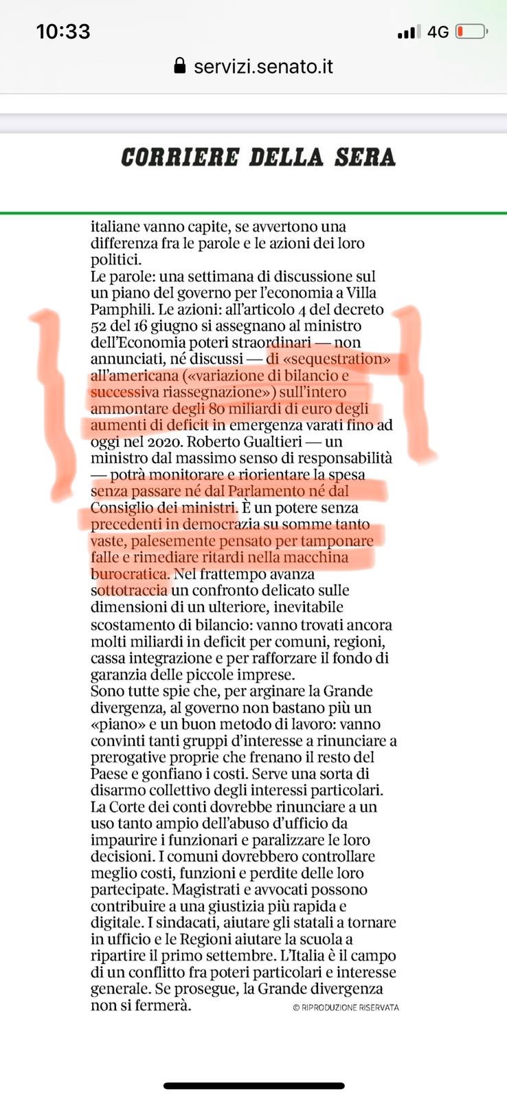 “…. Nel “Decreto Rilancio”, all’articolo 4 del decreto 52 del 16 giugno si assegnano al ministro dell’Economia poteri straordinari – non annunciati, né discussi – di «sequestration» all’ americana («variazione di bilancio e successiva riassegnazione») sull’ intero ammontare degli 80 miliardi di euro degli aumenti di deficit in emergenza varati fino ad oggi nel 2020. Roberto Gualtieri potrà monitorare e riorientare la spesa senza passare né dal Parlamento né dal Consiglio dei ministri. È un potere senza precedenti in democrazia su somme tanto vaste….”