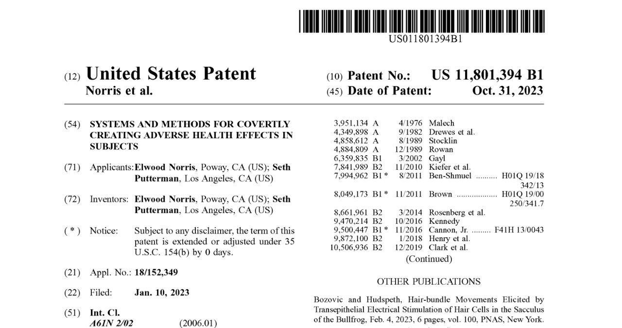 E’ stato registrato nel (https://zero5g.com/wp-content/uploads/2024/08/US11801394-Systems-and-methods-for-covertly-creating-adverse-health-effects-in-subjects-October-31.-2023.pdf) 2023 da Elwood “Woody” Norris (ex esterno NASA) col numero US 11,801,394 B1, il brevetto si chiama Sistemi e metodi per creare segretamente effetti negativi sulla salute nei soggetti.