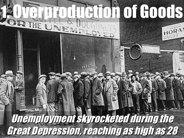 Secondo i capitalisti, si trattava di “sovrapproduzione”: i farmer producevano “troppo” grano, latte; le industrie “troppe” auto e altri beni; ciò faceva calare prezzi addirittura sotto i costi di produzione. Un disastro. Naturalmente i capitalisti non volevano vedere che, magari, la pretesa sovrapproduzione sarebbe stata assorbita, se le migliaia di famiglie e disoccupati che facevano la fila per una minestra al giorno, avessero avuto un salario da spendere.