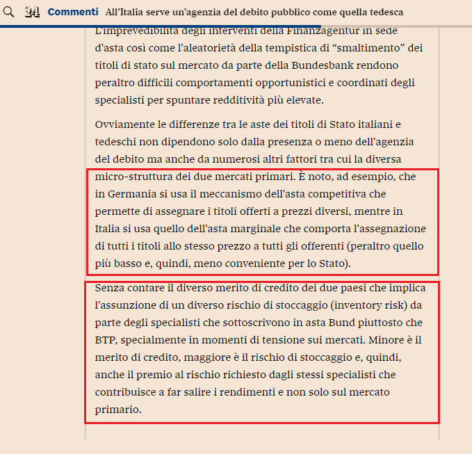 Perché noi usiamo l’asta marginale, e da quanto, non so; e non ho tempo di cercare (sospetto che sia un inghippo che risale a Ciampi e Andreatta per agganciarci con le catene agli investitori esteri…) . Fatto sta che questo sistema ha il sentore del tradimento, tanto più che non è mai stato cambiato per adottare l’asta competitiva come la Germania, nonostante periodiche critiche (deboli) di qualche giornalista economico.