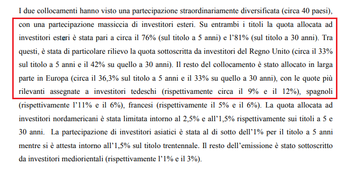 Dato il metodo che ha scelto il ministero per esitare i nostri titoli di debito pubblico (syndicate, un metodo di collocamento che vuole interessare gli speculatori esteri, e affida il compito a JP Morgan, Deutsche Bank, Societé Generale, Nomura eccetera, a cui paga un aggio) ha anche aggiunto un premio.