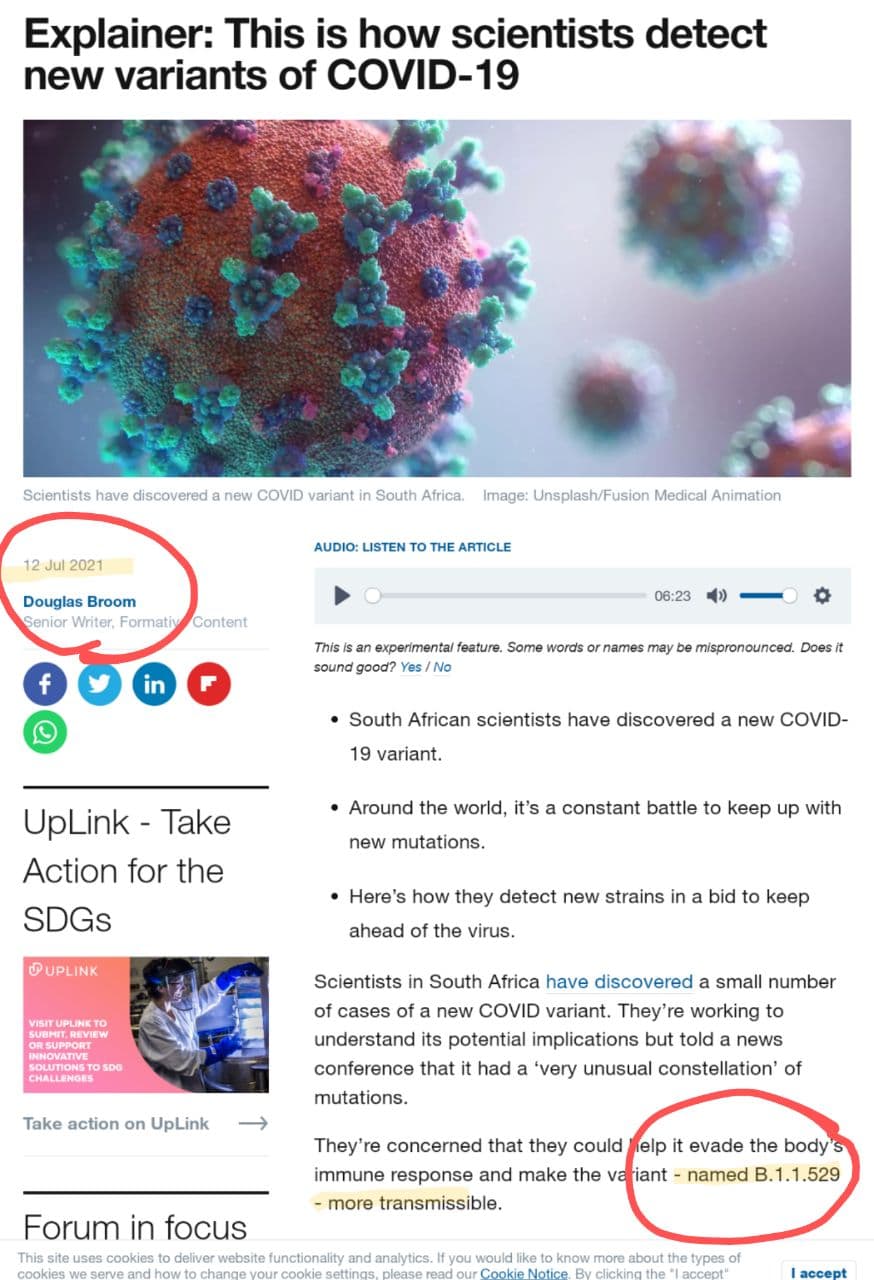 già il 12 luglio del 2021 conoscevano la variante sudafricana named B.1.1.529., condivido l’articolo pubblicato direttamente sul loro sito: https://www.weforum.org/agenda/2021/07/how-scientists-detect-new-covid-19-variants/