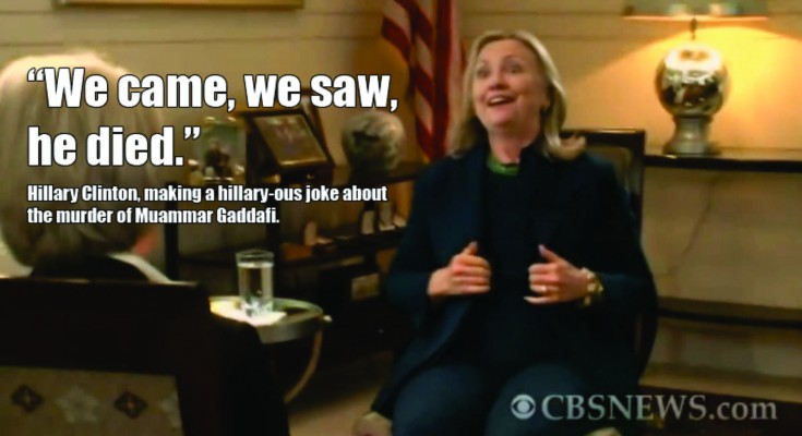 Non  occorrono prove per sapere quanto la signora Clinton si rallegri dei suoi delitti, con  una risata di trionfo che agghiaccia il cuore.  Abbiamo  un buon numero di video: quello del 20 ottobre 2011 in cui, in una intervista alla CNBC,  ride  quando apprende che in Libia è stato trucidato Gheddafi; e, emulando il detto d Cesare – Veni Vidi Vici –  se la ride: “Siamo venuti, abbiamo visto, lui è morto”.  Un anno dopo, ad essere ammazzato fu l’ambasciatore Usa in Libia Chris Stevens, che lei – la ministra – aveva lanciato in un losco  traffico di armi rubate dagli arsenali di Gheddafi per mandarle in Siria, ai jihadisti gestiti dalla Cia.