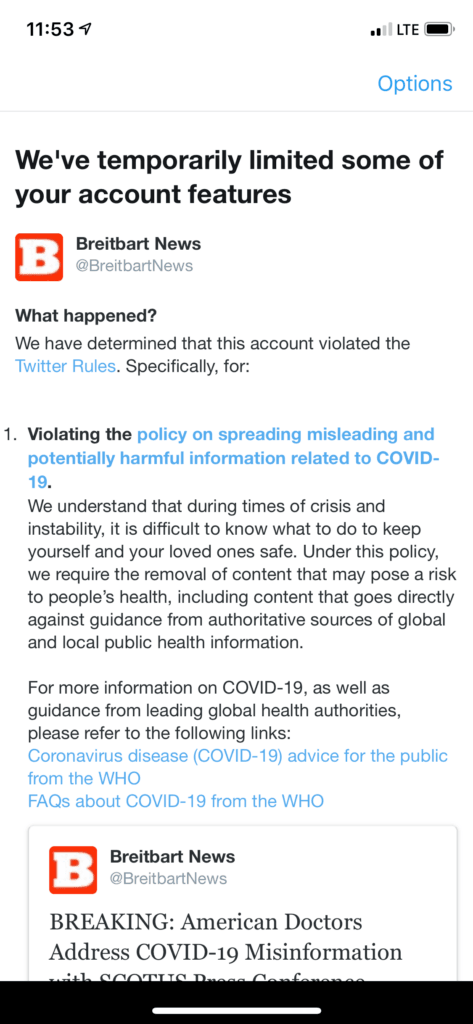 Infatti, per aver pubblicato la conferenza stampa della dottoressa Gold e colleghi pro-clorochina – diventata subito “virale”, come dice – twitter ha oscurato il sito conservatore Breitbard News, di cui Steve Bannon è stato l’anima. “Quasi 48 ore dopo, Twitter non ha ancora risposto o ripristinato la capacità di Breitbart di pubblicare post . Twitter ha rimosso il video e bloccato l’account Breitbart; una simile censura è stata operata da parte di YouTube e Facebook”, informa Zero Hedge. Il milione e mezzo di followers,se cercano di accedere, trovano un annuncio di Twitter che gli spiega che esso Twitter lo difende da informazioni ingannevoli e potenzialmente dannose sul Covid: TWitter è unicamente preoccupato di preservare l a salute vostra “e dei vostri cari”, non facendovi ascoltare i dottori.