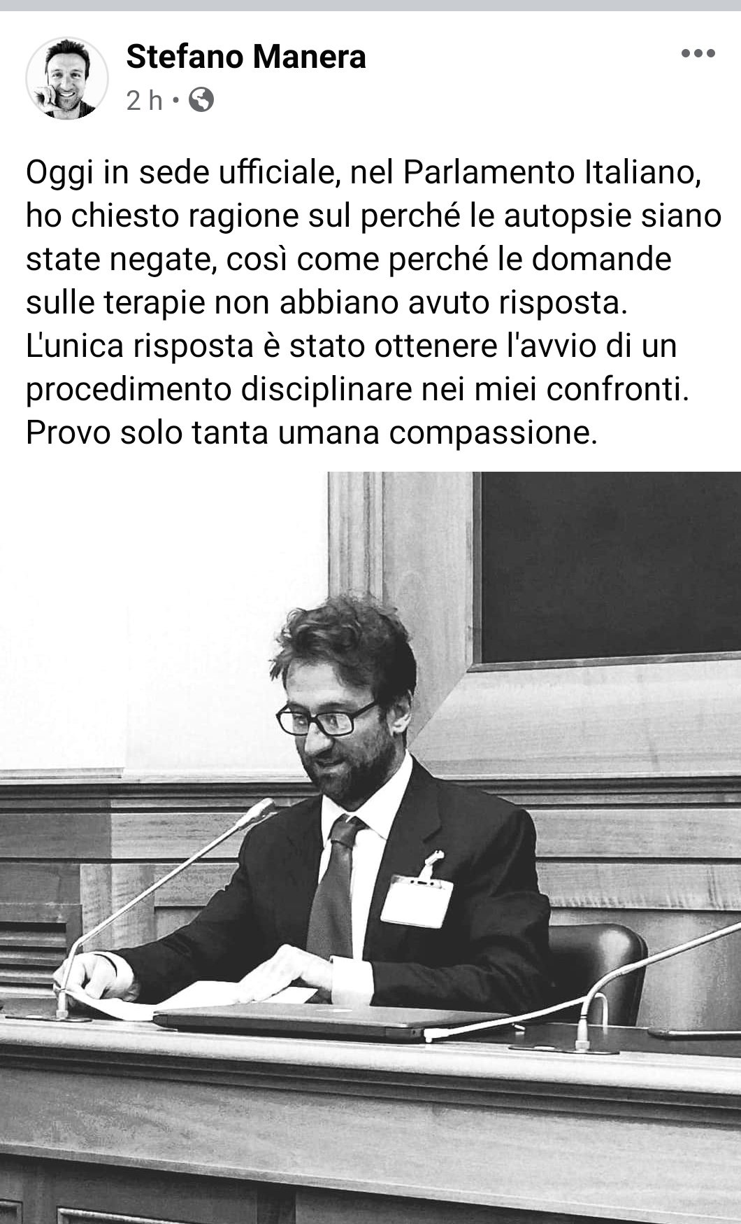Lo stesso mercoledì 29 contro il dottor Stefano Manera è stato avviato un procedimento disciplinare. Il dottor Manera è l’anestesista che, lavorando fra gli agonizzanti all’ospedale di Bergamo nei due mesi della crisi acuta da coronavirus, ha identificato l’errore di diagnosi,corretto il quale la malattia è divenuta trattabile con la nota terapia a domicilio. Manera, con Tarro e Bracco, in sede di parlamento italiano aveva chiesto “perché le autopsie erano state negate e le domande sulle terapie non abbiano avuto risposta”.