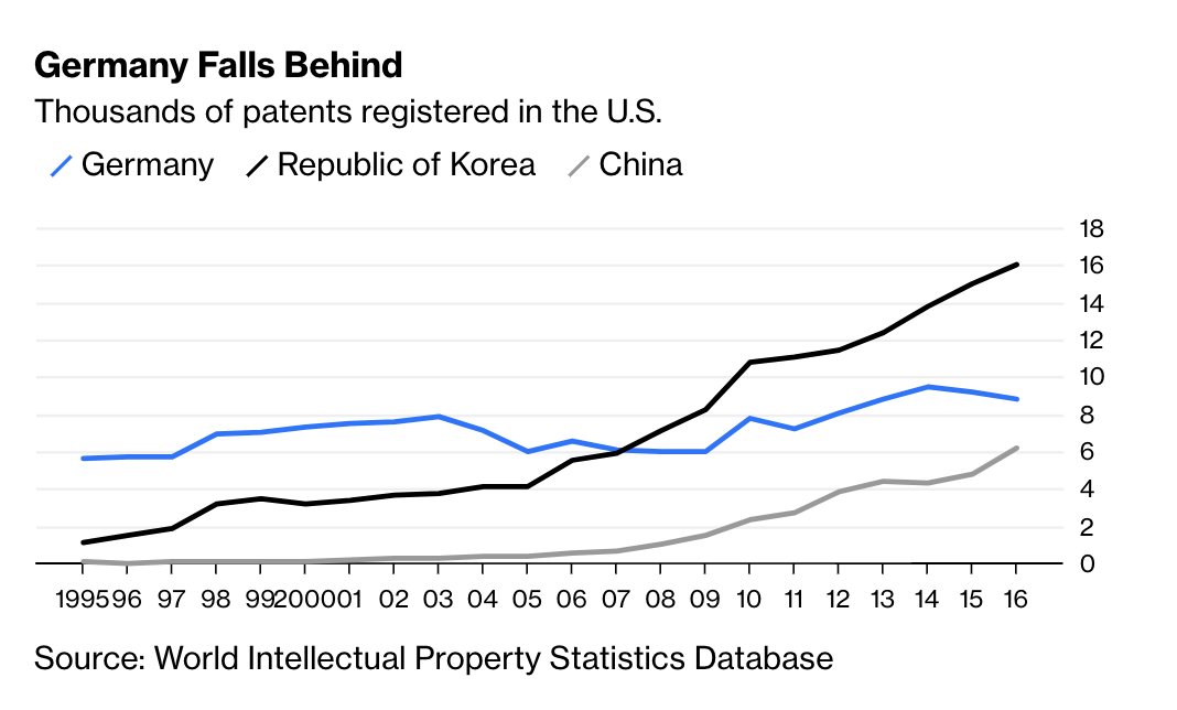 Peggio: “E’ dal 2007 che le aziende coreane hanno raggiunto la Germania nel registrare brevetti; ed ora ne registrano quasi il doppio dei tedeschi, grazie agli enormi investimenti in istruzione e ricerca”.