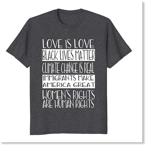 Direte: che cosa c’entra questa tiritera. C’entra. Sono le frasi che compaiono sulla t-shirt che la mammina indossava l’estate scorsa, abbracciata teneramente al suo bambino. Come ha scoperto lo scrittore Joe Quinn, la maglietta si compra su Amazon e viene indossata come manifesto ideologico progressista e sfida (a Trump e a tutto ciò che incarna).
