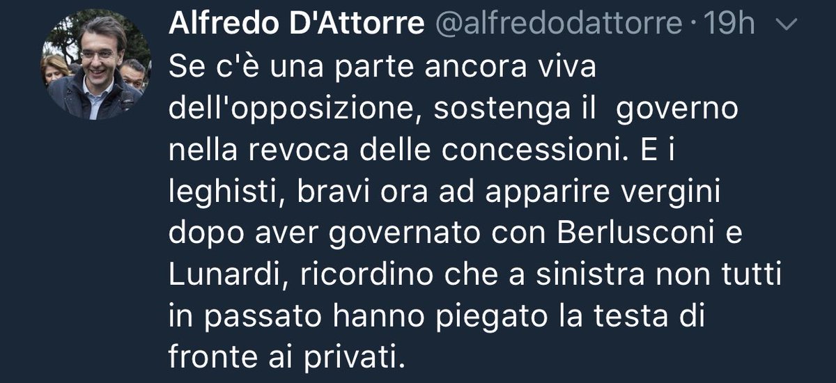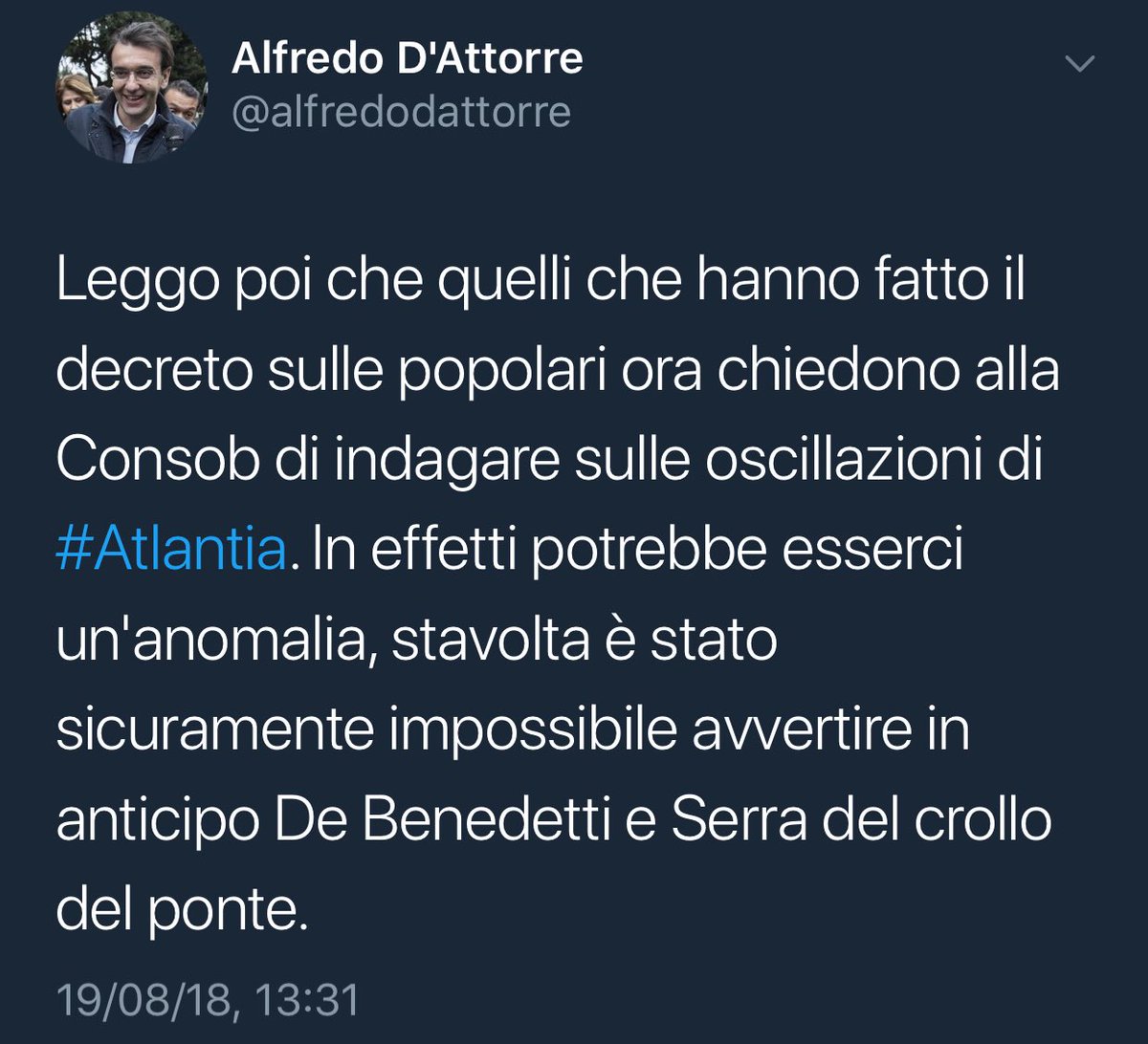“Leggo che quelli che hanno fatto il decreto sulle Popolari ora chiedono alla Consob di indagare sulle oscillazioni di Atlantia. In effetti potrebbe esserci un’anomalia, stavolta è stato sicuramente impossibile avvertire in anticipo De Benedetti e Davide Serra del crollo del ponte”.