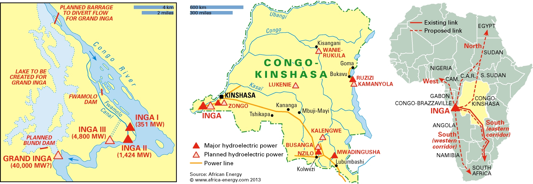 La diga “Inga 3” sul fiume Congo, che potrebbe cominciare ad essere costruita dall’anno prossimo con capitali cinesi, un mega-progetto, equivalente a venti centrali nucleari,  che da solo  coprirebbe il 40% del fabbisogno africano,  e nelle intenzioni venderebbe elettricità anche all’Egitto.